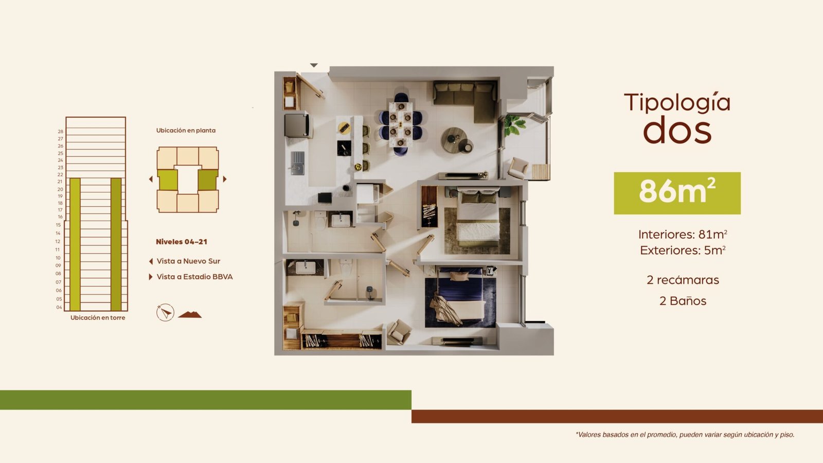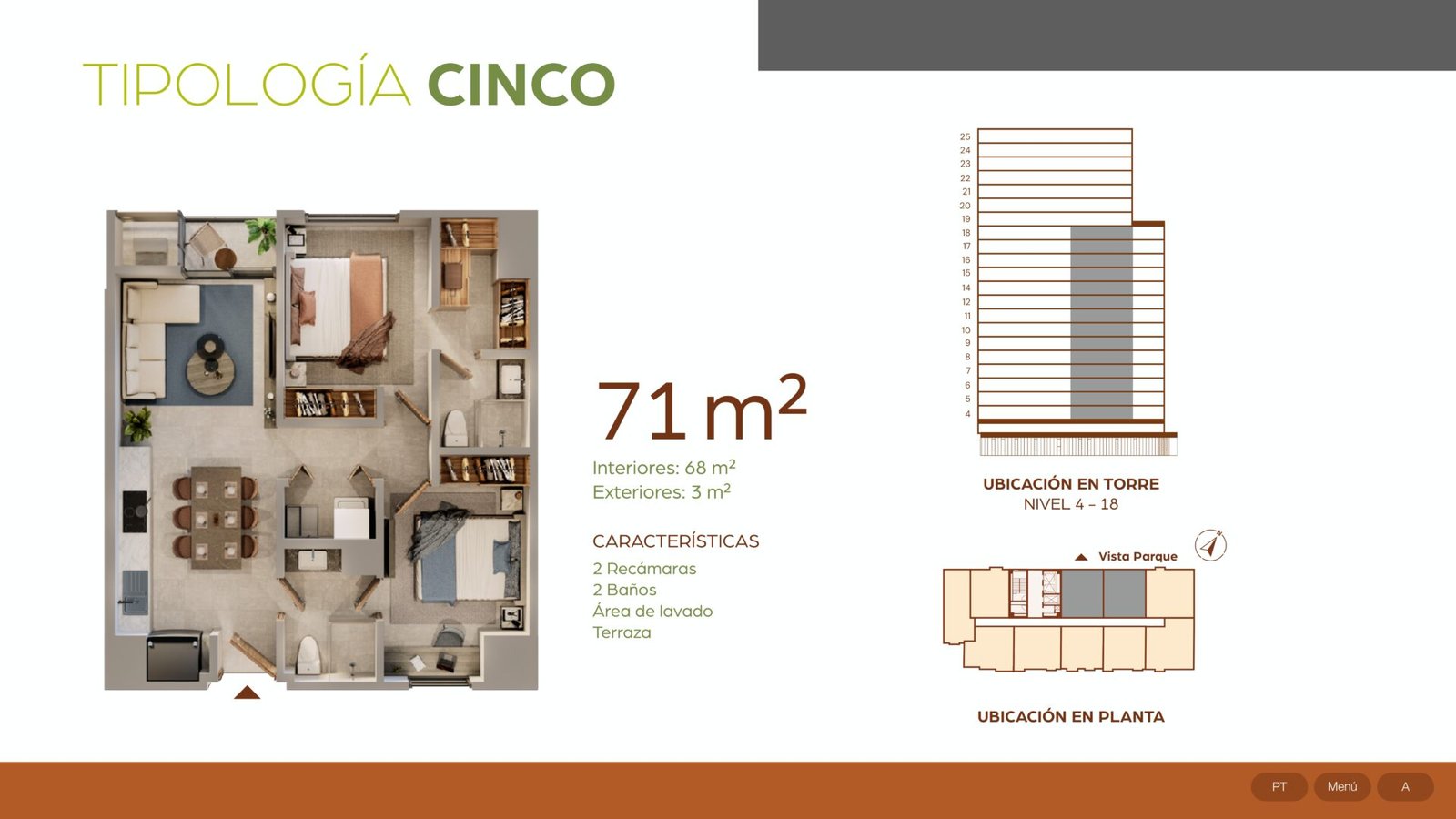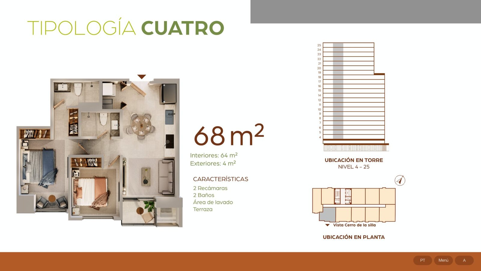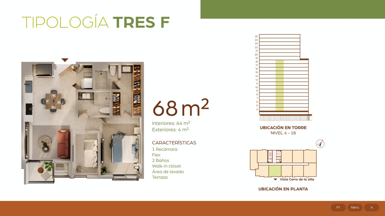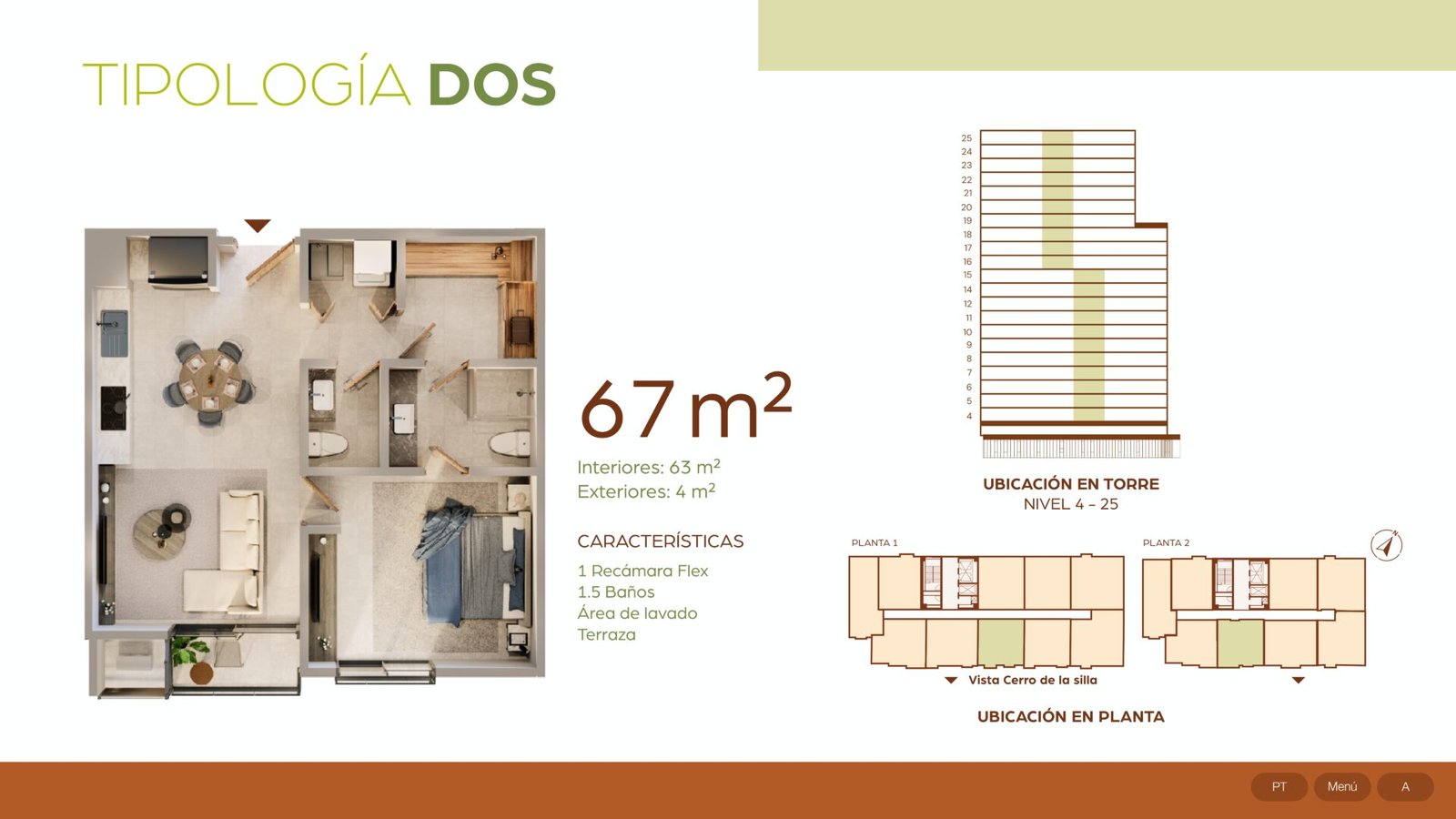 Con opción de vista hacia el cerro de la silla Superficie interior= 64m2 Superficie exterior= 4m2 Tipología 3F cuenta con una recámara y un flex Tipología 3F cuenta con una recámara y area social extendida.