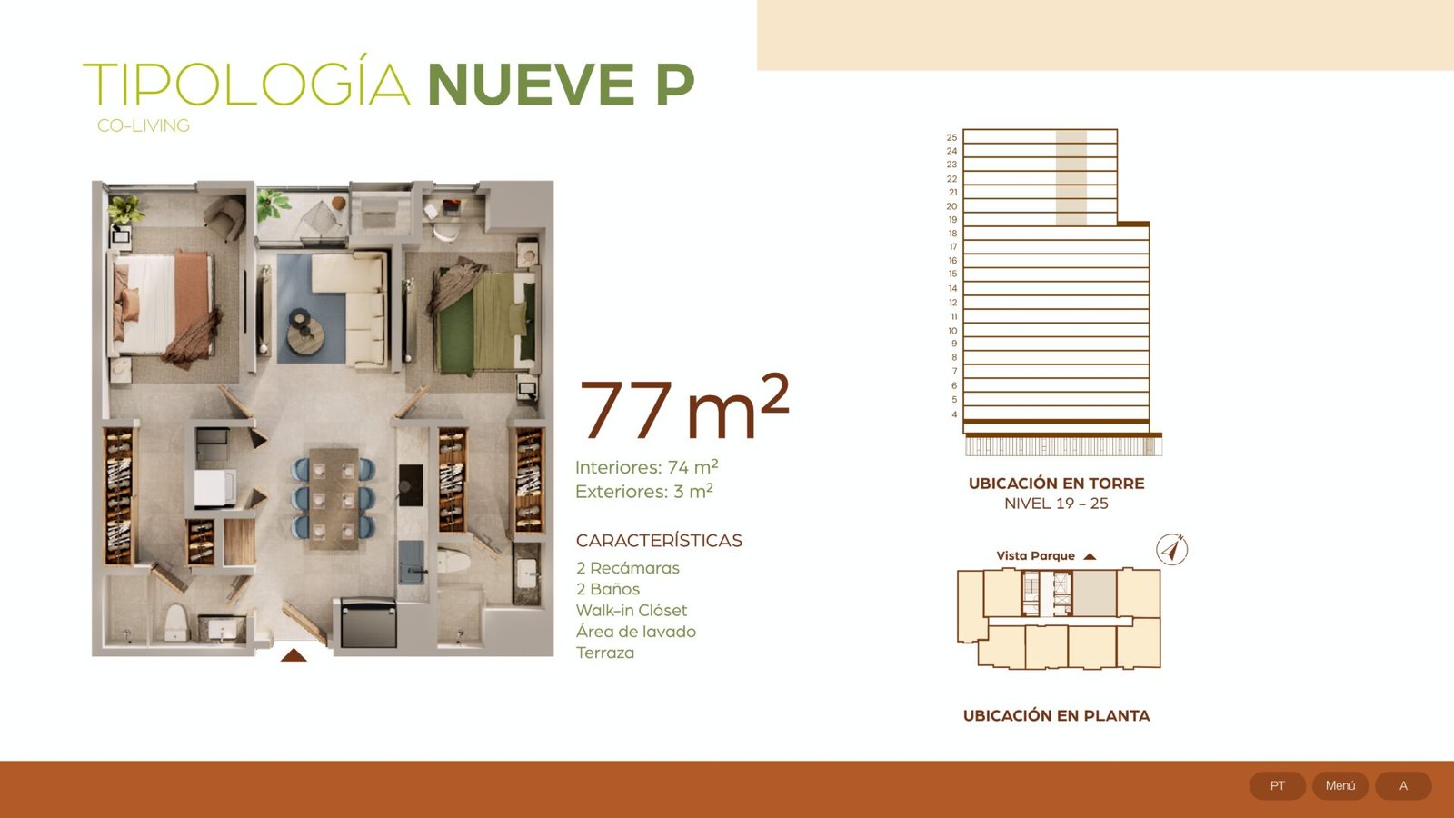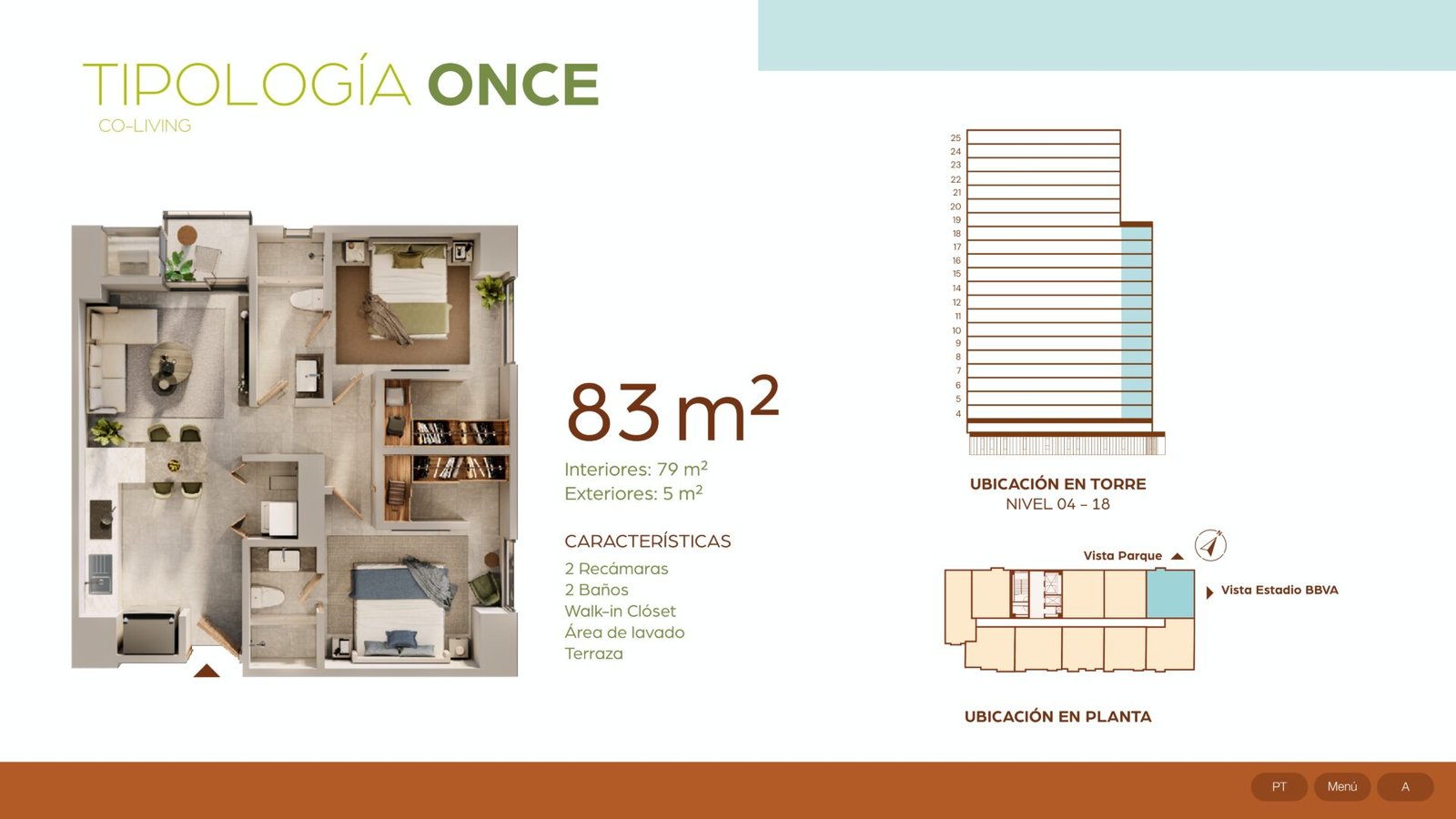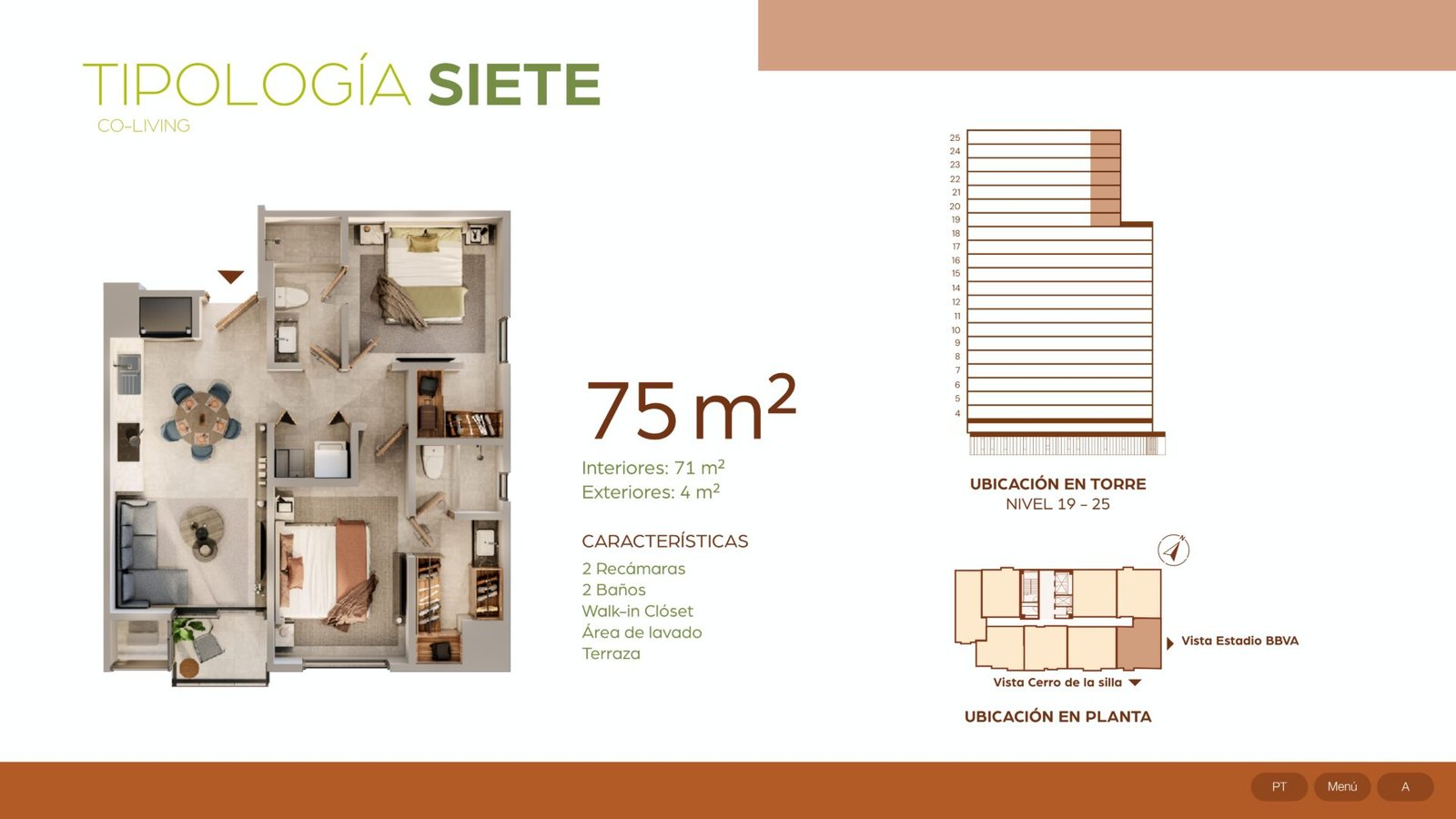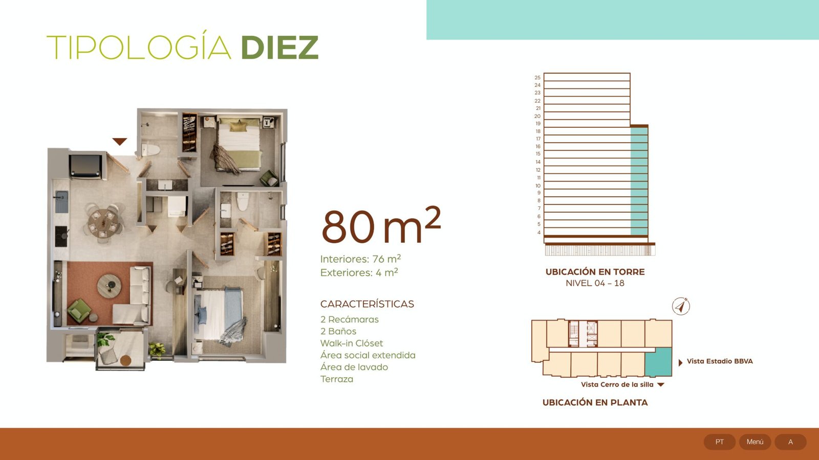 Prototipo en esquina con vistas hacia el cerro de la silla y hacia el estadio BBVA Superficie interior= 76m2 Superficie exterior= 4m2